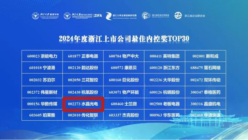 近日,由浙江大學管理學院、浙江大學財務與會計研究所(ZIFA)、浙江大學全球浙商研究院、浙江省總會計師協會、浙江省企業聯合會、浙江大學會計專業學位研究生教指委聯合主辦的“第八屆企業高質量發展與管理創新論壇——2024浙江上市公司內部控制指數發布會暨企業管理現代化創新成果報告會”在浙江大學舉行。大會揭曉了“2024年度浙江上市公司最佳內控獎TOP30榜“,水晶光電獲此殊榮。