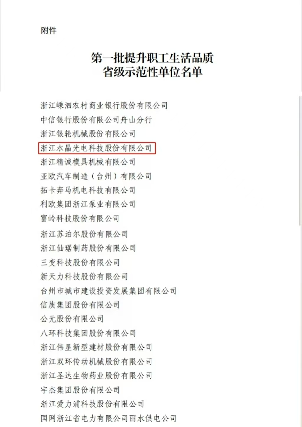 近日,浙江省總工會發(fā)布第一批提升職工生活品質(zhì)省級示范性單位名單,水晶光電成功入選!