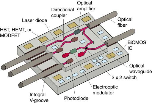 圖1 一種集成光子芯片,包含了發(fā)光二極管、波導(dǎo)、光電二極管、定向耦合器、光子交換器等微納元件。