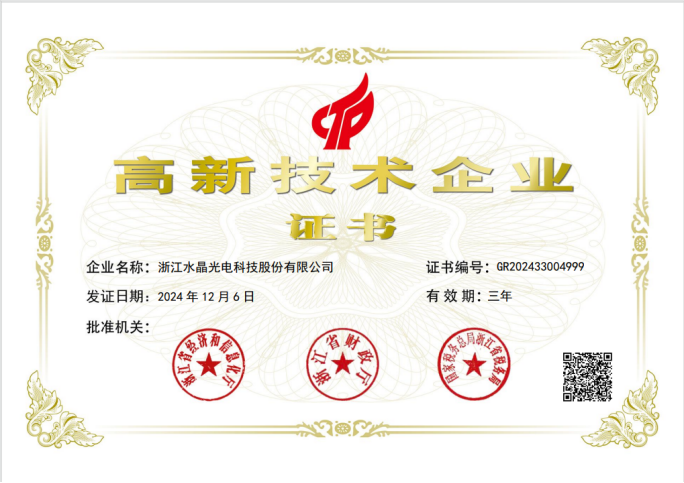 水晶光電深耕光學賽道,以薄膜光學、光學冷加工、半導體光學、光學系統設計等核心技術為軸,布局消費電子、車載光電、AR/VR三大行業,構建成長第二、第三曲線。公司現為國家制造業單項冠軍示范企業、中國電子材料行業五十強企業、浙江省雄鷹培育企業、浙江省創新型領軍企業、浙江省隱形冠軍、國家高新技術企業、國家知識產權管理優勢企業。截至報告期末,公司參加制修訂國家標準4項、行業標準2項。榮獲“2024 AIIA汽車智能化領航創新獎-卓越應用獎”“中國VR/AR30強企業”,公司的卓越成就和技術創新得到肯定。